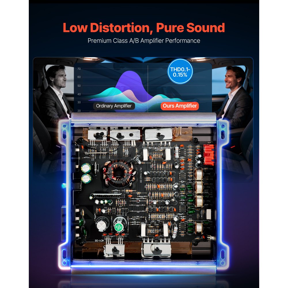 Nagy teljesítmény, kiemelkedő teljesítmény: Ez a 2 csatornás AB osztályú autórádió-erősítő akár 2 x 300 W @ 4 ohm / 2 x 600 W @ 2 ohm (max.) teljesítményt nyújt a tiszta, stabil kimenet érdekében még nagy hangerőn is. Élvezze a teljes és erőteljes autós hangzást.