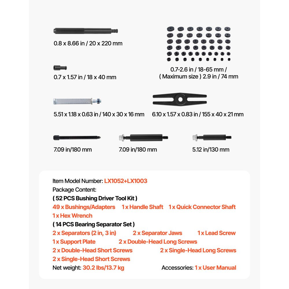 Átfogó méretek: Csapágyprés készletünk különféle méretű csapágyak szétszerelésére alkalmas. 52 + 14 darab általánosan használt tárcsahüvely-mérettel és számos szerelési tartozékkal van felszerelve a komplett szerszámokhoz.