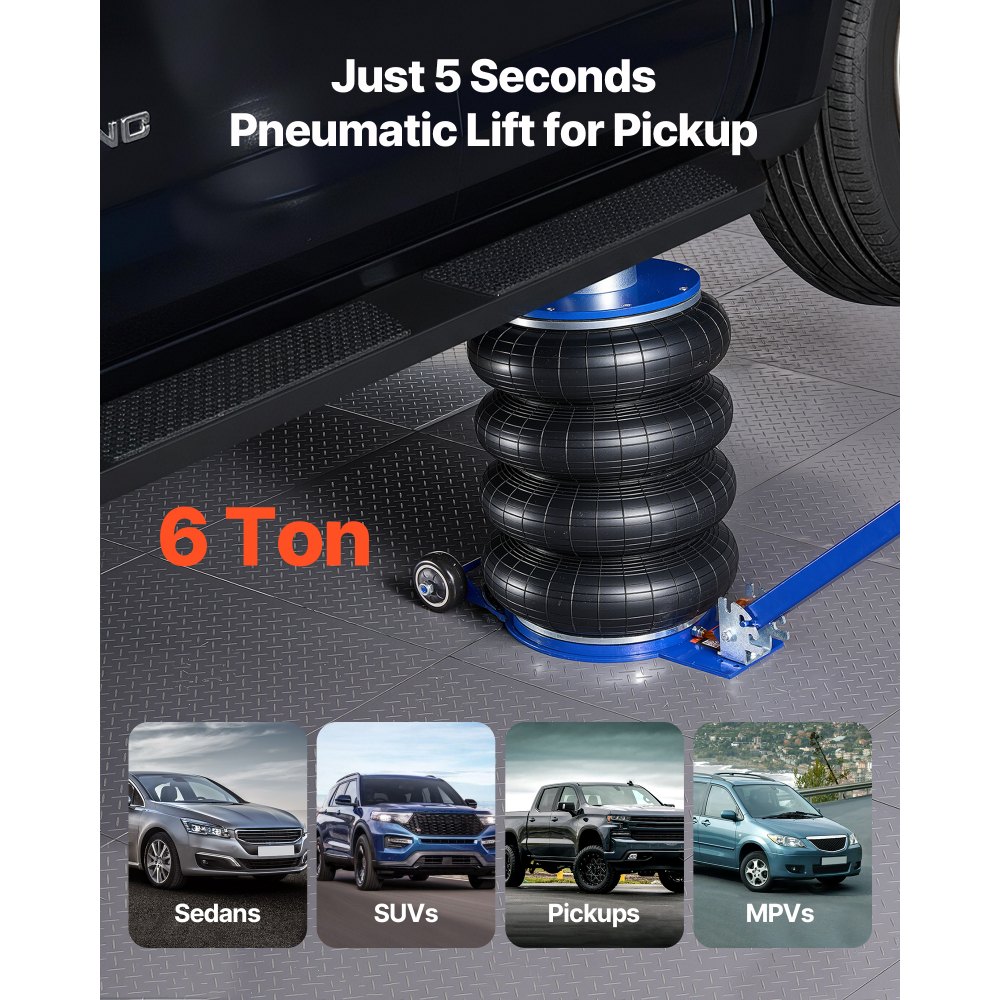 6 tonna teherbírás: Ez a légzsákos emelő akár 6 tonnát/13227 fontot is elbír, szedánokhoz, terepjárókhoz, pickupokhoz és teherautókhoz alkalmas. Megerősített négyrétegű légzsákja és szélesített alaplapja erős, stabil emelési teljesítményt biztosít.