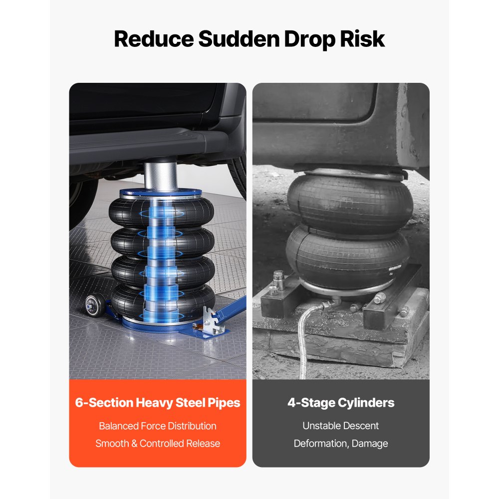 Gyors emelés másodpercek alatt: Az állítható fogantyúnak és a gumikerekeknek köszönhetően az autóemelő könnyen beilleszthető az autó alá. Csatlakoztassa egy légkompresszorhoz, és emelje fel autóját mindössze 2-5 másodperc alatt – nagyszerű a gyors autójavításhoz. Hosszú távú megtámasztáshoz használja emelőbakkal.