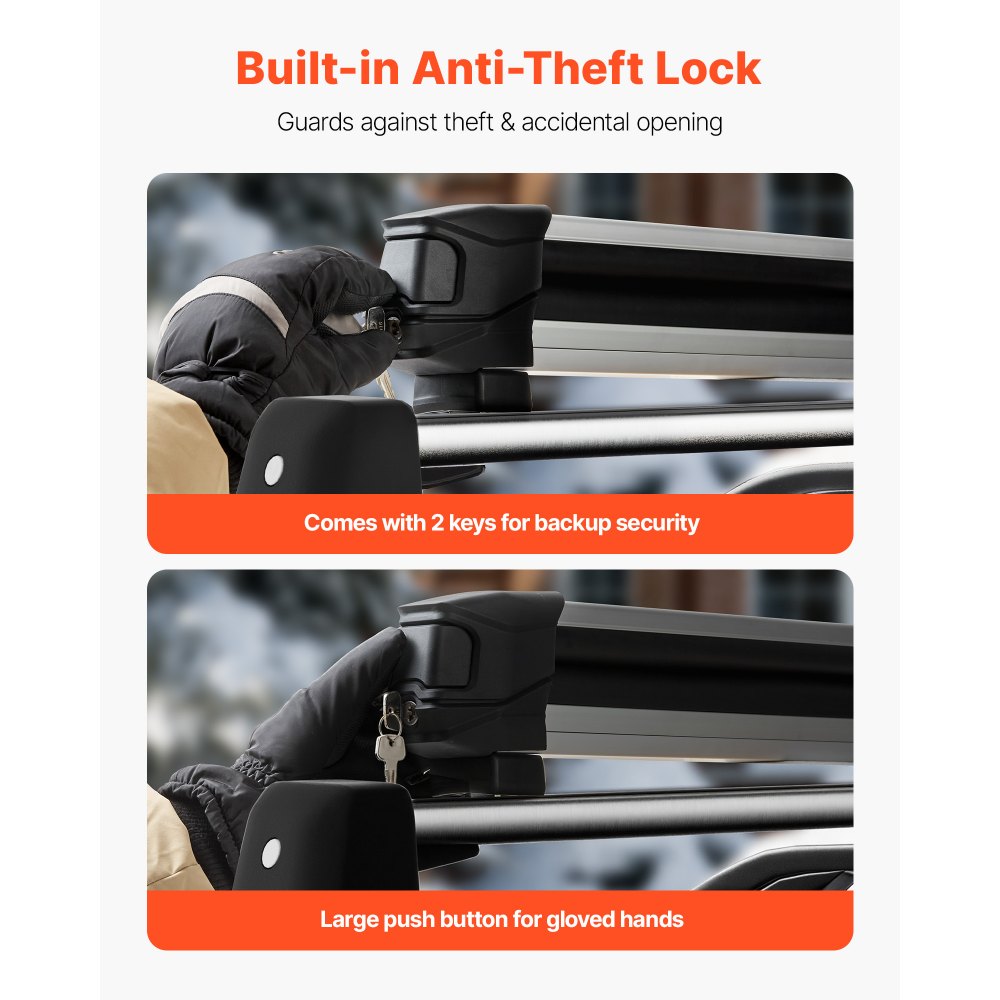 Lopásgátló zár: Ez a síléctartó beépített lopásgátló zárral rendelkezik, amely biztosítja a felszerelés biztonságát utazás közben. Két kulccsal rendelkezik, hogy elkerülje az elvesztésből eredő kellemetlenségeket. A nagyméretű gombos kialakítás lehetővé teszi a könnyű kezelhetőséget, még kesztyűben is.