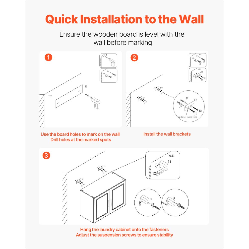 Stabil szerkezet: Forgácslapból és MDF-ből készült, ez a falra szerelhető mosókonyhát akár 72,6 kg-os súlyt is elbír. A fali rögzítők és a perforált lapok biztosítják a biztonságos rögzítést, így hosszú távon is stabil marad, dőlés nélkül.