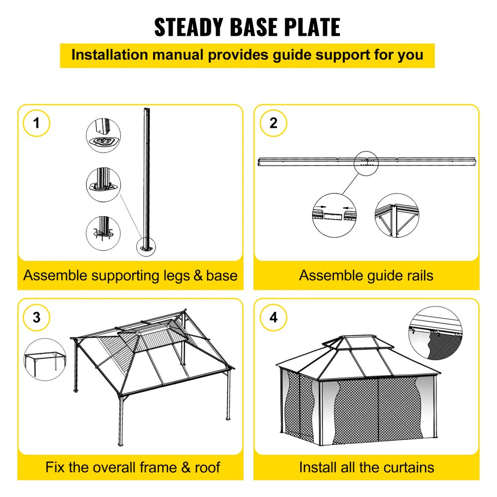 【ALUMÍNIUM VÁZ】 - Pavilonunk előtetője rozsdamentes alumínium tartóvázból készült. Minden szükséges szerelvény és szerelési útmutató mellékelve van a könnyű összeszerelés érdekében. Lyukakkal ellátott lábak és talajba szorított cövekek a fokozott stabilitás érdekében, négy sarok megerősített a nagyobb tartósság érdekében.