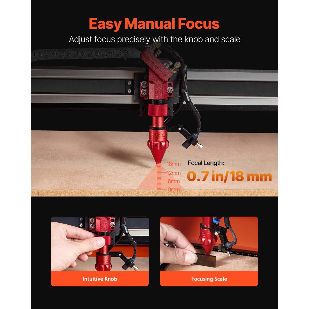 Egyszerű manuális fókuszálás: Állítsa be a lézerfej helyzetét a kezelőpanel segítségével. Finomhangolja a fókuszt a gombbal vagy a munkaasztal emelésével és süllyesztésével. A fókuszskála által vezérelt CO2 lézergravírozó vágó optimális gravírozási pontosságot biztosít.