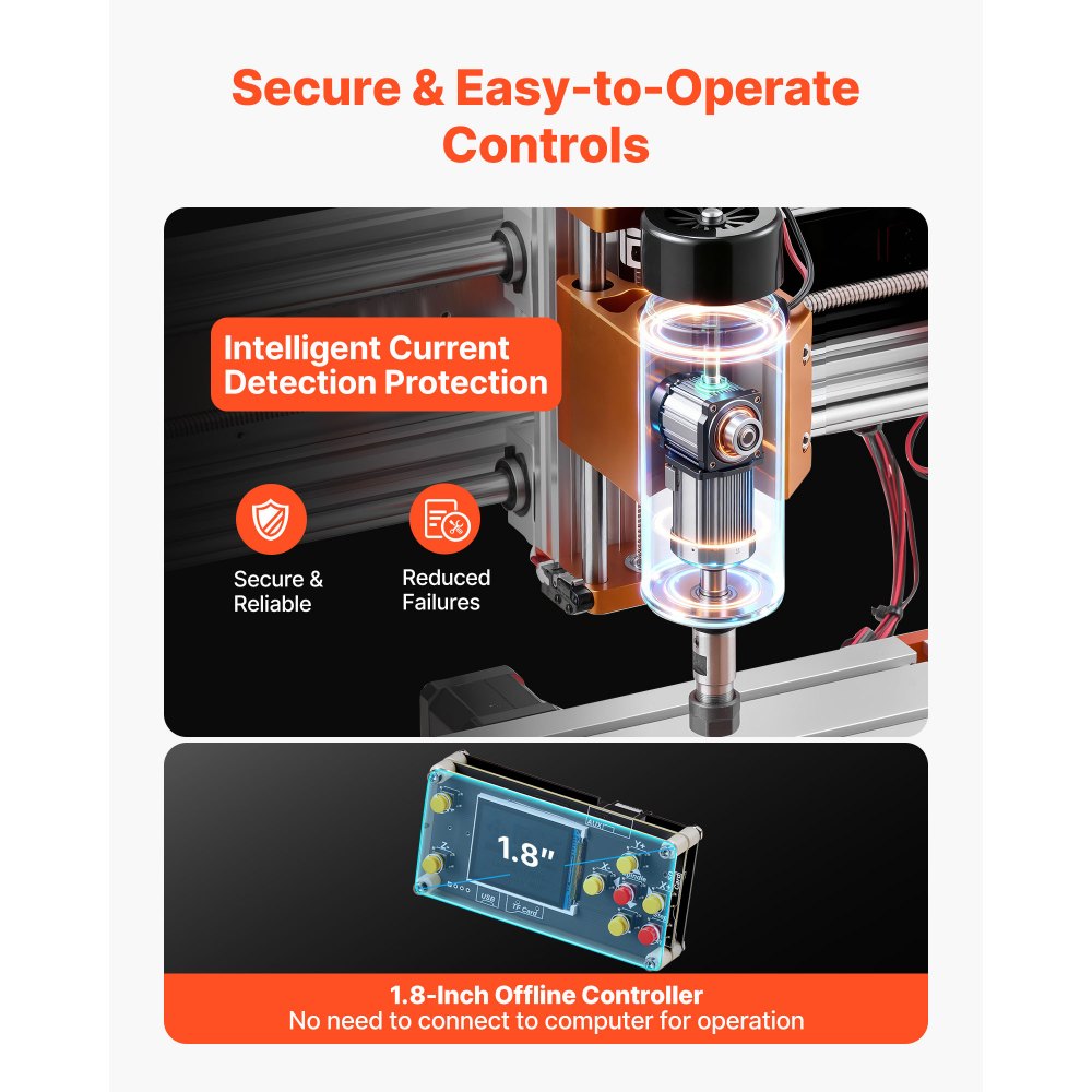 Biztonságos és tartós kialakítás: Az orsó áramérzékelő védelemmel rendelkezik, ami csökkenti a hibákat és akár 5000 órára is meghosszabbítja az élettartamot. A CNC marógép 6 végálláskapcsolóval, vészleállítóval és kézikerekekkel rendelkezik az XYZ tengelyeken a precíz működés érdekében.