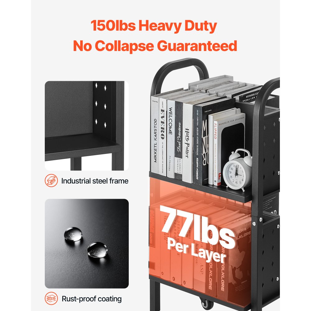 Stabil teherbírás: Nagy szilárdságú szénacélból készült, a gurulós könyveskocsi minden rétege 35 kg-ot bír el, teljes teherbírása 70 kg. A rozsdaálló bevonat tartósságot biztosít, ideális nehéz könyvekhez vagy berendezésekhez.
