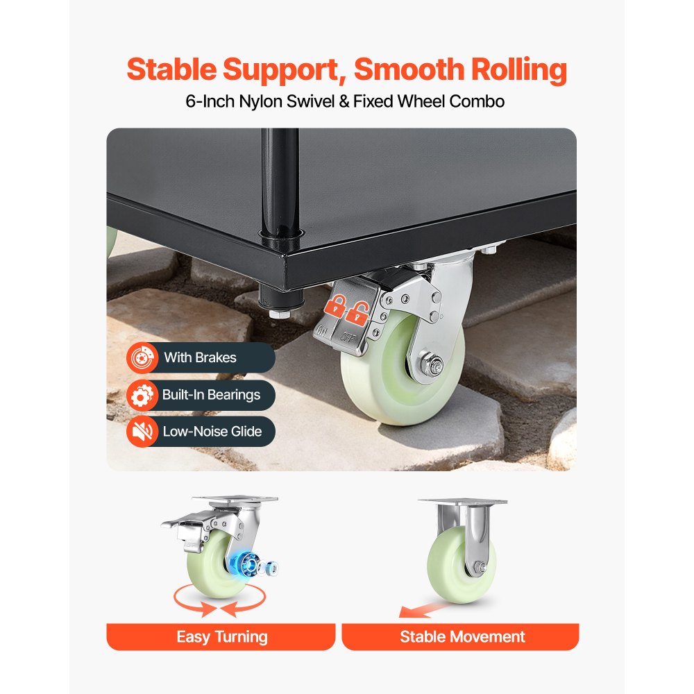 Nejlon kerekek, sima gördülés: Négy 5 hüvelykes nejlon kerékkel felszerelve – kettő forgó kerék lábfékkel és két fix kerékkel. Ez a platformos kocsi 360°-os mobilitást és alacsony zajszintű működést biztosít, a fékek pedig stabil parkolást biztosítanak.