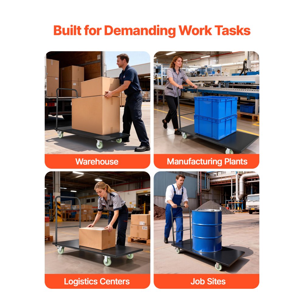 Széleskörű ipari és kereskedelmi felhasználás: Ez a kerekes, lapos platójú kocsi ideális raktárakba, műhelyekbe, áruudvarokba és egyéb ipari vagy kereskedelmi környezetekbe. Könnyedén mozgat nehéz rakományt, és segít javítani a munkafolyamatok hatékonyságát.