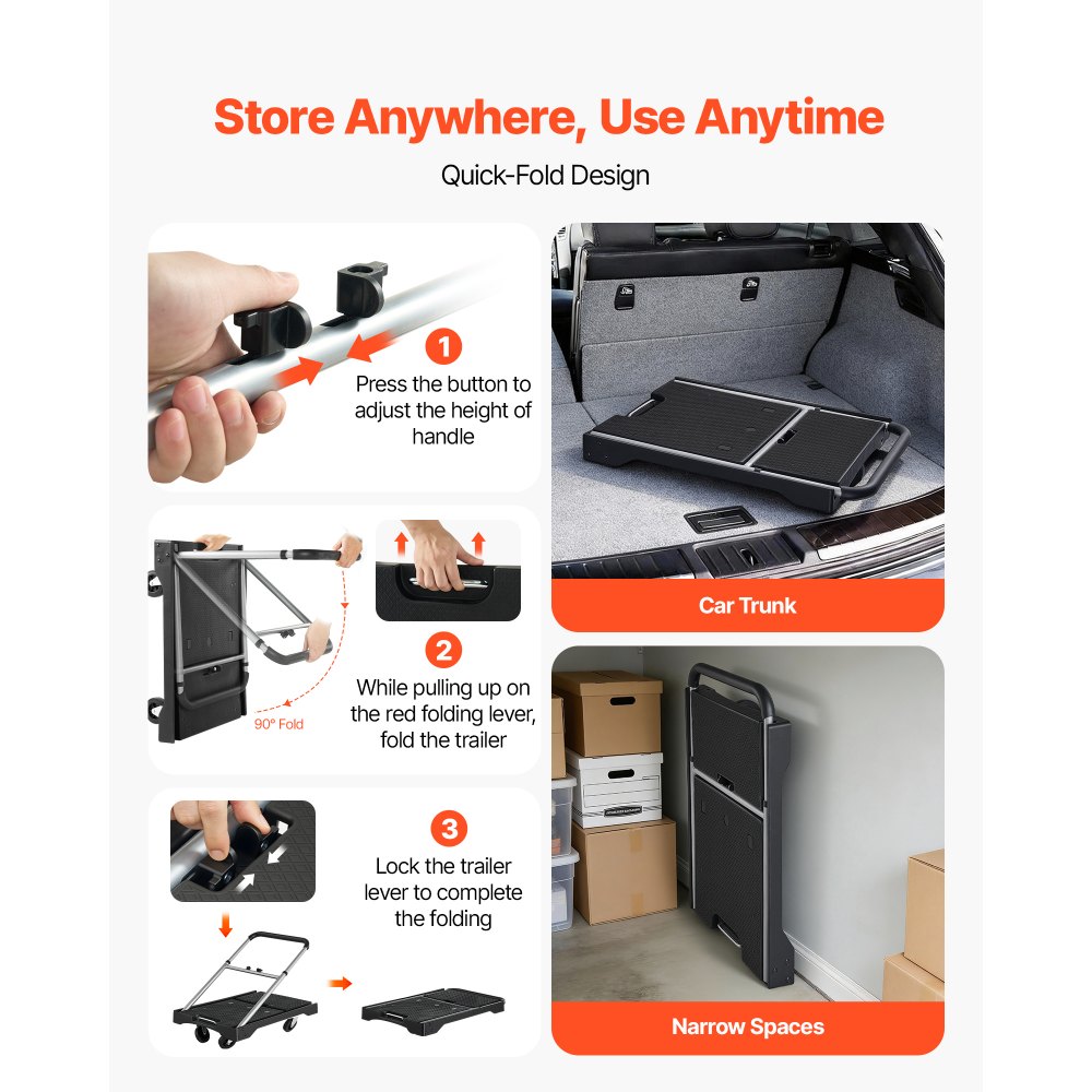 összecsukható kézikocsi, 149,69 kg teherbírás, összecsukható platós kocsi forgó kerekekkel, mozgó platformos kézikocsi platós kocsi, állítható tolófogantyú, könnyű tároláshoz, 680 x 495 x 115 mm | Építés és szerkezetek - Jovotech.hu