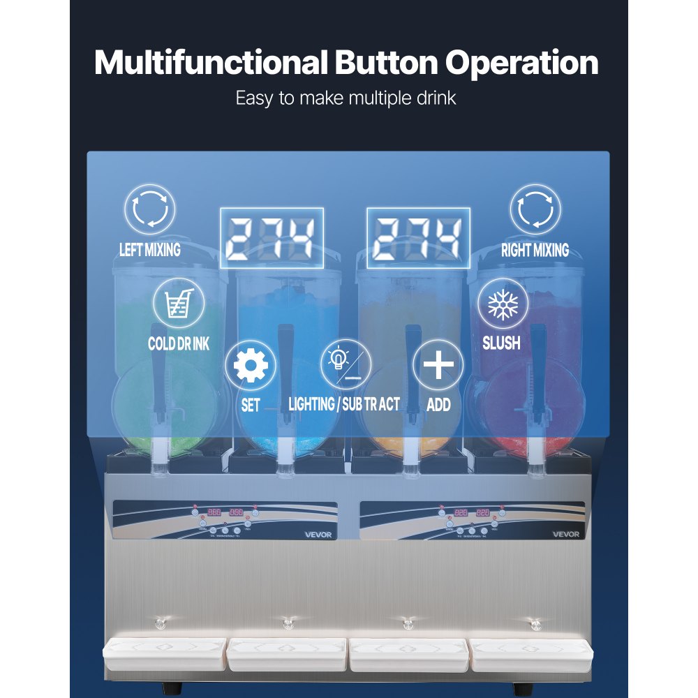 4 tartály, független beállítások: Négy 12 literes / 3,17 gallonos tartállyal ez a jeges italkészítő gép adagonként körülbelül 192 csésze jeges italt tud készíteni, és mindegyik tartályt külön is használhatja. Ritkábban kell utántölteni, így ideális a nagy forgalmú kereskedelmi használatra. Az átlátszó tartály gyönyörűen mutatja be a színes italokat, így kiválóan alkalmas fagylaltozókba, hamburgerezőkbe, kávézókba, bárokba és egyéb kereskedelmi környezetekbe.