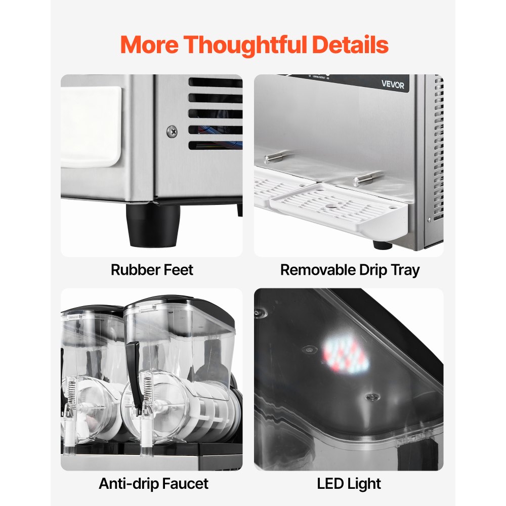 Különféle italokhoz: Ez a továbbfejlesztett kereskedelmi forgalomban kapható jegeskávéfőző 5 és 50℉ / -15 és 10℃ között állítható hőmérséklet-tartománnyal rendelkezik, így szabályozhatja italai lágyságát vagy keménységét. Hideg italokhoz: 3 és 5℃ / 37,4 és 41℉ között; alkoholmentes jegeskávékhoz: -3 és -1℃ / 26,6 és 30,2℉ között; alkoholos italokhoz: -15C és -6C / 5F és 21,2℉ között. (Ajánlott cukortartalom: körülbelül 13%, alkoholtartalom: 13% alatt). Ideális különféle italok, például gyümölcslevek, tea, margarita és jegeskávé készítéséhez.