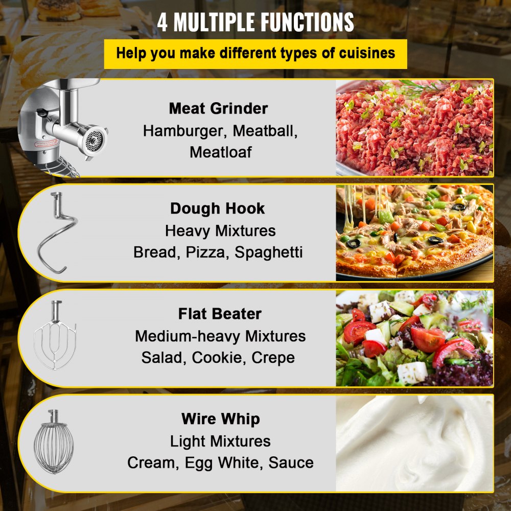 Sokoldalú gép: Kereskedelmi álló mixerünk kettő az egyben kialakítású, amely tartalmaz mind ételkeverési, mind húsdarálási funkciót. Ezzel a multifunkcionális funkcióval gépünk kielégíti a különféle igényeket a finom ételek elkészítésében. Ezenkívül ételmixerünk 3 keverővel van felszerelve, köztük egy dagasztóhoroggal, egy lapos keverővel és egy habverővel. Ezek a tartozékok segítenek a különböző étel-összetevők összekeverésében, és a kívánt eredmény elérésében bármilyen recepthez.