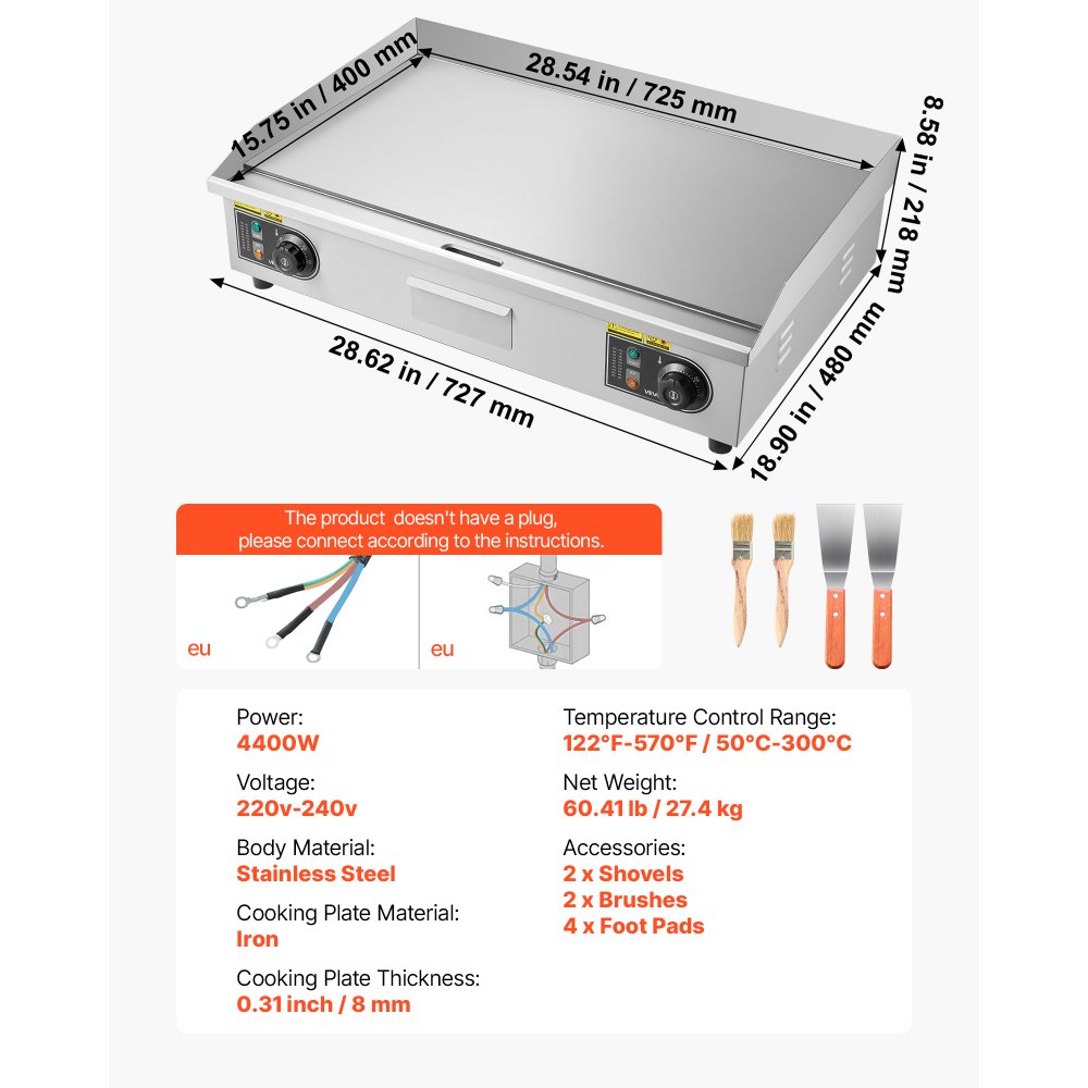 kereskedelmi elektromos grillsütő, 725 x 400 mm, 4400 W, 50-300 °C állítható hőmérséklet-szabályozással, rozsdamentes acél munkalapra szerelhető, teljesen lapos tetejű grillsütő 2 spatulával és 2 kefével, steakhez és palacsintához (csatlakozó nélkül) | Ételkészítő berendezések - Jovotech.hu