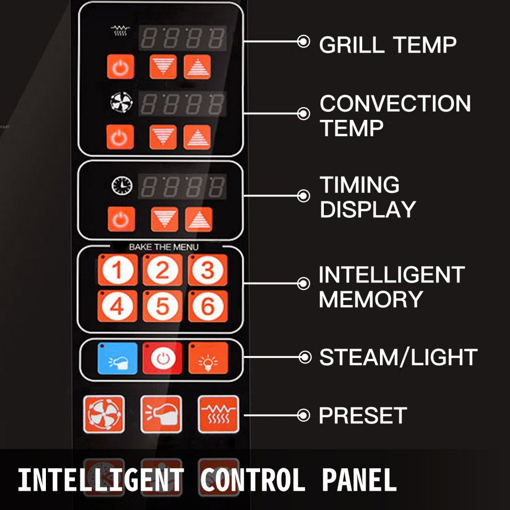 【INTELLIGENS VEZÉRLÉS】 - A kenyérpirító sütő-légkeveréses fritőz kombinációja mikroszámítógéppel vezérelt intelligens panellel rendelkezik, amely lehetővé teszi a hőmérséklet (0-350 ℃) és az idő precíz szabályozását. 6 előre beállított gombbal a könnyű sütéshez.