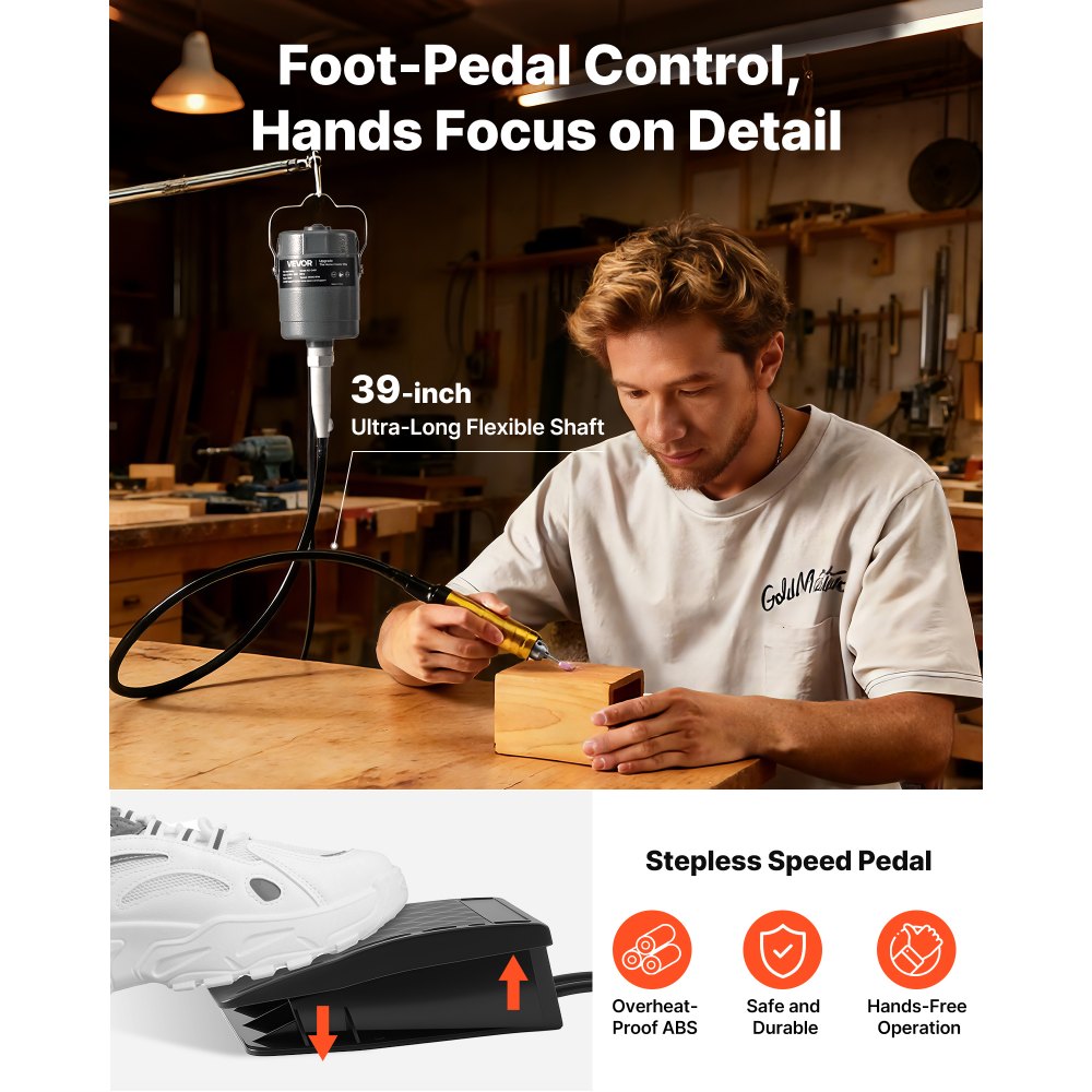 Kézhasználat nélküli lábpedál: A fokozatmentes sebességszabályozás a lábpedállal zökkenőmentesebb munkafolyamatot biztosít, így mindkét keze a szerszámok részletes kezelésére koncentrálhat. Túlmelegedésálló ABS-ből készült a biztonságos és megbízható működés érdekében.