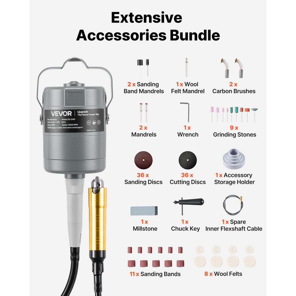 Erős motorteljesítmény: A 780 W-os rézmotorral hajtott, akár 25000 ford/perc sebességű VEVOR flexibilis tengelyű csiszoló sima és hatékony teljesítményt nyújt, precízen és gyorsan elvégezve a csiszolási, köszörülési, vágási és polírozási feladatokat.