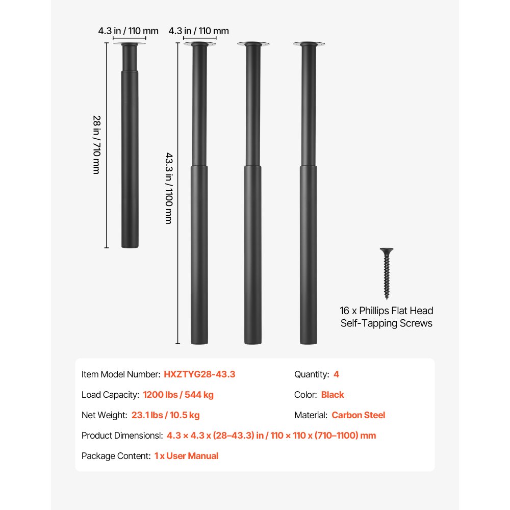 állítható asztallábak, 710-1100 mm acél bútorlábak, 544 kg maximális teherbírás, nagy teherbírás, gyors telepítés, ideális otthoni irodai asztalokhoz, barkácsoláshoz, kávézó-, vacsoraasztalokhoz, munkapadokhoz, 4 darabos készlet, fekete