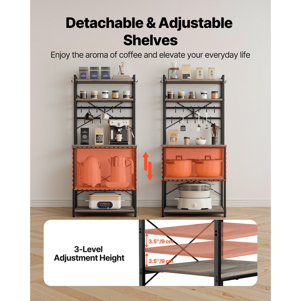 Három szinten állítható magasság: Kávéfőzőnk az alapvető konyhai tároláshoz és a mindennapi használathoz készült. A felső munkalapon kisebb sütők vagy kávéfőzők helyezhetők el, míg a középső és alsó drótpolcok három magassági beállításban állíthatók, egyenként 9 cm-es magasságban, összesen 27 cm-es magasságban, így alkalmasak légkeveréses fritőzök, mixerek vagy tárolórekeszek számára.