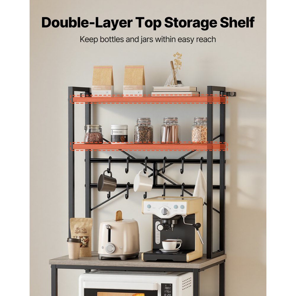 Átgondolt kialakítás: 12 fém kampóval a konyhai kiegészítőkhöz, négy állítható lábbal a padlófelület variálásához, valamint a mellékelt szerelési hardverrel és egy borulásgátlóval, álló péksütemény-tartónk a mindennapi használhatóságra összpontosít. A dupla drótpolcok és a natúr faerezetű asztallap egyaránt támogatja a konyhai tárolást és a háztartás rendszerezését.