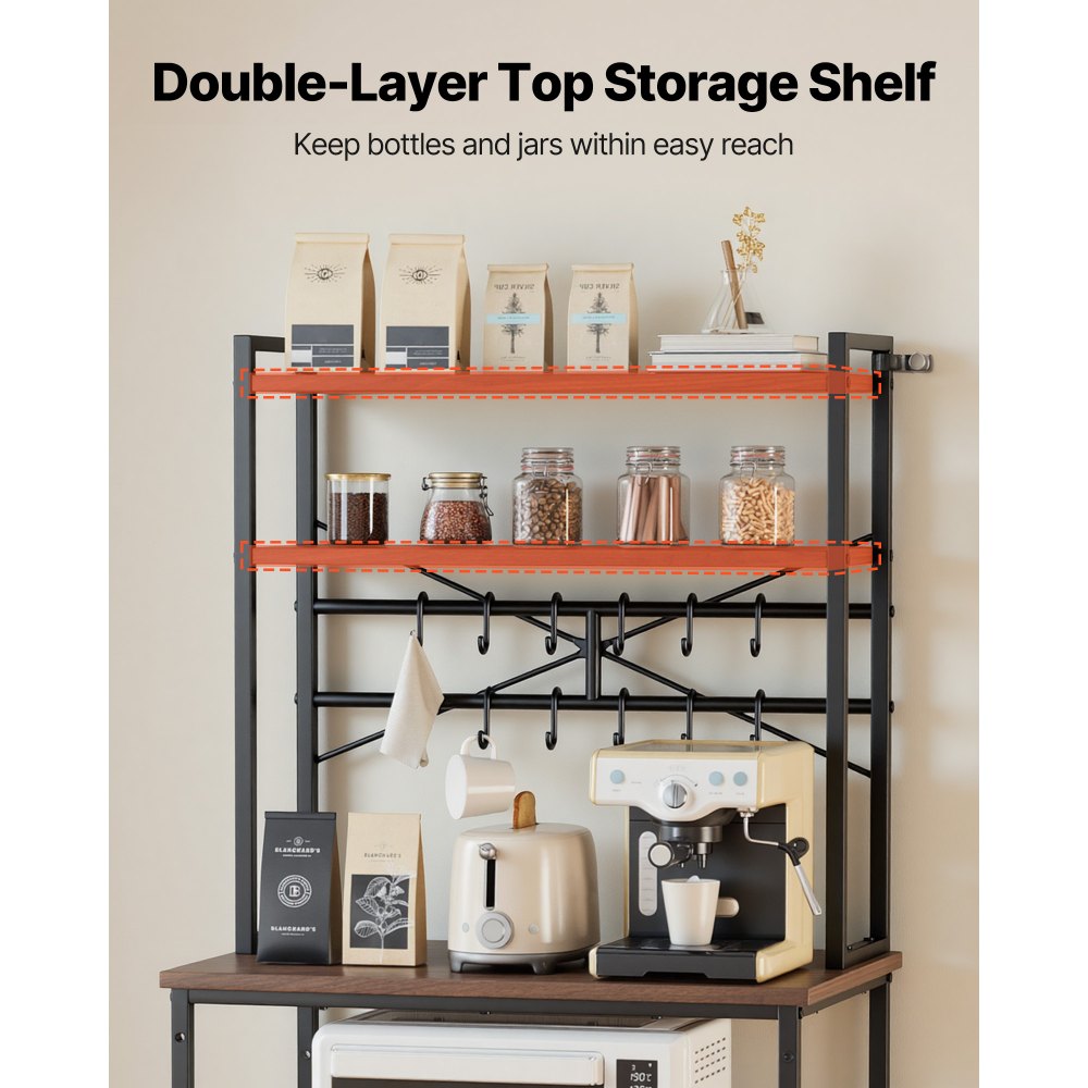 Három szinten állítható magasság: Kávéfőzőnk hatékony függőleges tárolást tesz lehetővé, felső munkalappal a sütőeszközök és kellékek számára. A középső és alsó drótpolcok három magassági beállításban állíthatók, egyenként 9 cm-es magasságban, összesen 27 cm-es magasságban, lehetővé téve az edények, mixerek és tárolódobozok rugalmas elhelyezését.