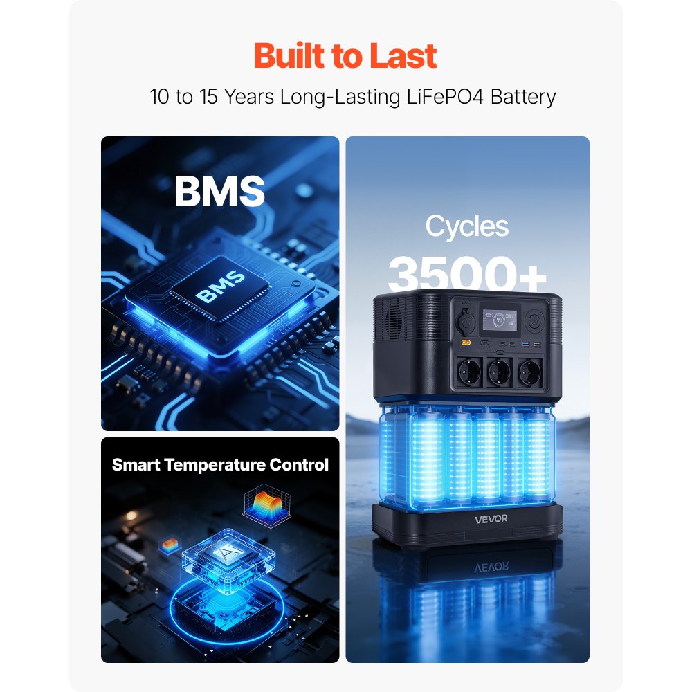 Tartós kialakítás: Prémium LiFePO₄ akkumulátorral készült, amely akár 3500 töltési ciklust is kibír, és 10-15 év élettartamot biztosít. Fejlett BMS rendszer biztosítja a fokozott biztonságot, biztosítva a megbízhatóbb és hosszabb élettartamú áramellátást.