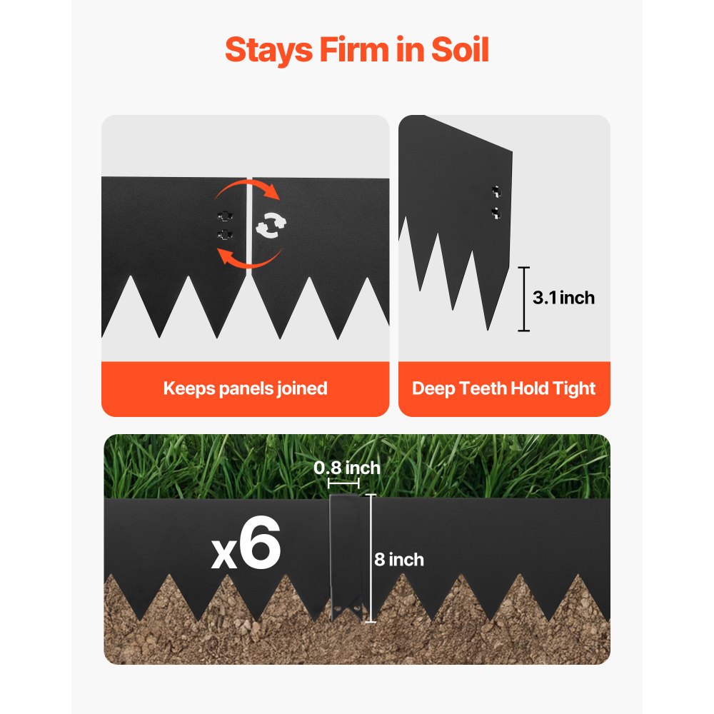 Teljes készlet, használatra kész: Ez a fém kerti szegélykészlet 6 szegélyelemet, 6 kapcsot és 1 pár kesztyűt tartalmaz. A meghosszabbított tüskék simán csúsznak a talajba, így a beállítás könnyebb és élvezetesebb.