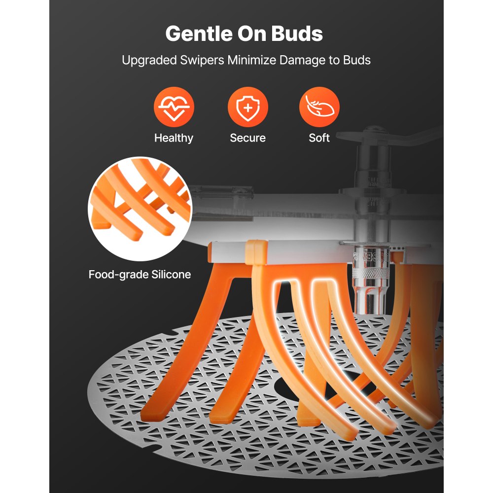 Tartós és könnyen karbantartható: A gyors szétszerelésre és tisztításra tervezett éles rozsdamentes acél pengék tiszta, hatékony vágásokat biztosítanak kevesebb erőfeszítéssel. Az állítható és cserélhető pengék különböző vágási igényeket elégítenek ki. Az élelmiszeripari minőségű szilikon ujjak szagtalanok és gyengédek a betakarított gyümölcsökhöz, megőrizve a termék minőségét.