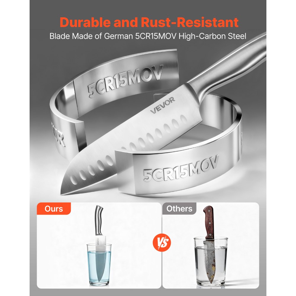 Tartós és rozsdaálló: Német 5CR15MOV magas széntartalmú rozsdamentes acélból készült, ez a késblokk-készlet nagy keménységet és szívósságot kínál, elkerülve a lepattogzást vagy repedést. A pengék hő- és hidegkezelésen, valamint passziváláson esnek át, így rozsdaálló felületet és tartós élességet biztosítanak még párás konyhákban is.