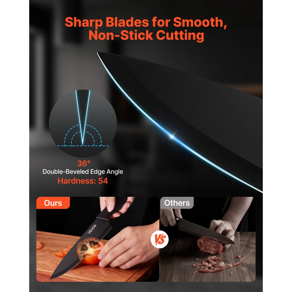 Tartós és rozsdaálló: Német 5CR15MOV magas széntartalmú rozsdamentes acélból készült, ez a késblokk-készlet keménységet és szívósságot biztosít, elkerülve a lepattogzást vagy repedést. A pengék hőkezelt, homokfúvott és tapadásmentes bevonattal vannak ellátva, hogy rozsdaállóak és élesek maradjanak még a párás konyhákban is.