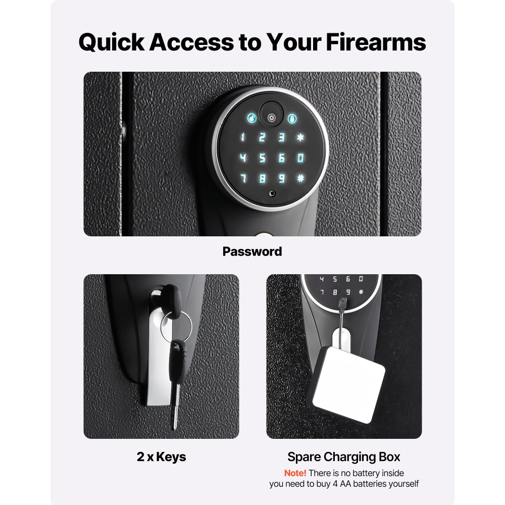 Intelligens zár: 9 számjegyű érintőképernyős PIN-kódos zár gyors hozzáféréssel. A PIN-kód hossza 3–8 számjegy között állítható; az automatikus zár zárja a széfet záráskor. Tartalmaz egy vészkulcsot és egy külső töltőportot, így a fegyverszekrényt akkor is kinyithatja, ha lemerült az akkumulátor.