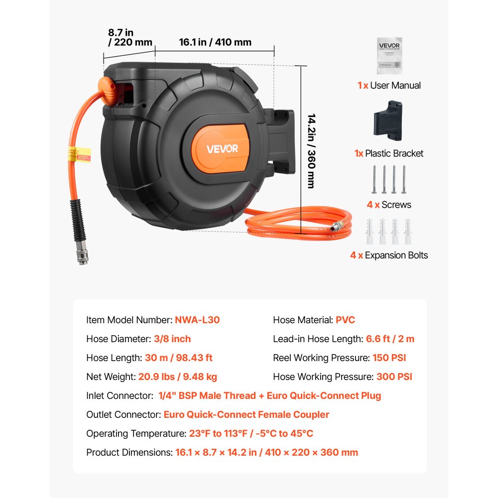 Nincs több összegubancolódott tömlő: A VEVOR visszahúzható légtömlő-dob 30 m x 9,5 mm-es PVC légtömlőt és egy 2 m-es bevezető tömlőt tartalmaz, hogy munkaterülete tiszta és gubancolódásmentes maradjon. Nincs több tömlő, amely a padlón húzódik, ami csökkenti a kopást és a botlásveszélyt a biztonságosabb használat érdekében.