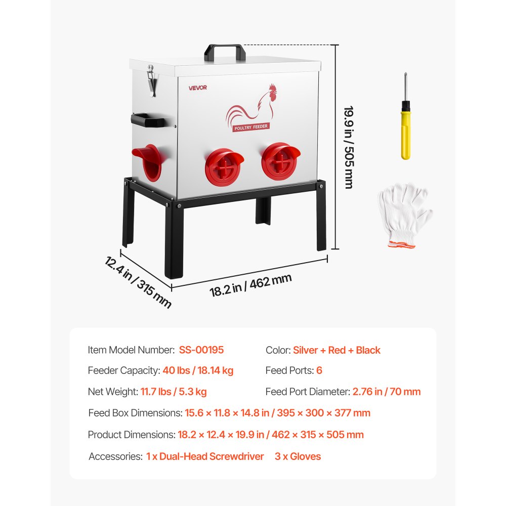 Tartós és hosszú élettartamú: Horganyzott acélból készült, PP etetőnyílásokkal, ez a vízálló csirkeetető rozsda- és korrózióálló, valamint könnyen tisztítható. A megerősített acéllábak beltéri vagy kültéri használatra is alkalmasak. Részletes útmutatóval és szerszámokkal a gyors összeszereléshez.