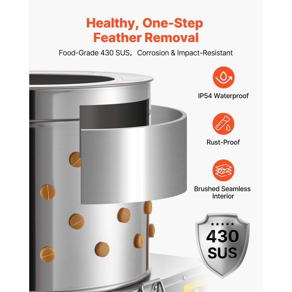 Prémium kivitel a tartósságért: IP54-es besorolású vízálló külső burkolattal és 430-as rozsdamentes acél anyagból készült, korrózióálló, 0,03 hüvelyk (0,7 mm) vastag hengerrel. Baromfikopasztónk megerősített lábakkal és 2 fix, valamint 2 forgókerékkel rendelkezik, amelyek stabil mozgást biztosítanak egyenetlen talajon is.