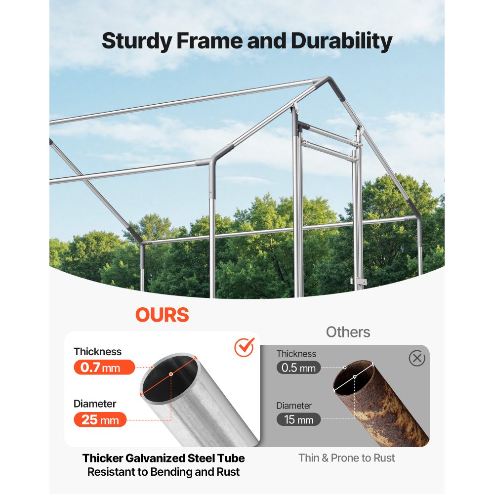 Tágas lakótér: Ez a nagyméretű, 6,56x6,56x6,56 láb / 2x2x2 méteres fém tyúkól négyoldalas szellőzéssel rendelkezik, egészséges és kényelmes környezetet teremtve. A PE bevonatú ponyva napvédelmet, vízállóságot és szakadásállóságot biztosít, így megvédi baromfiját a külső elemektől.