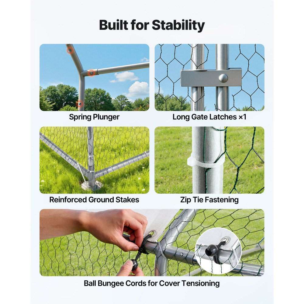 Masszív szerkezet: Az 2,5 cm vastag horganyzott acélcsöveknek és a precíz hegesztéseknek köszönhetően ez a csirkeudvar stabilitást és szélállóságot biztosít. A felső fedél hatékony vízelvezetést tesz lehetővé, megakadályozva a víz felgyülemlését. A hatszögletű védőhálóval megerősítve biztonságosabb helyet biztosít a baromfinak.