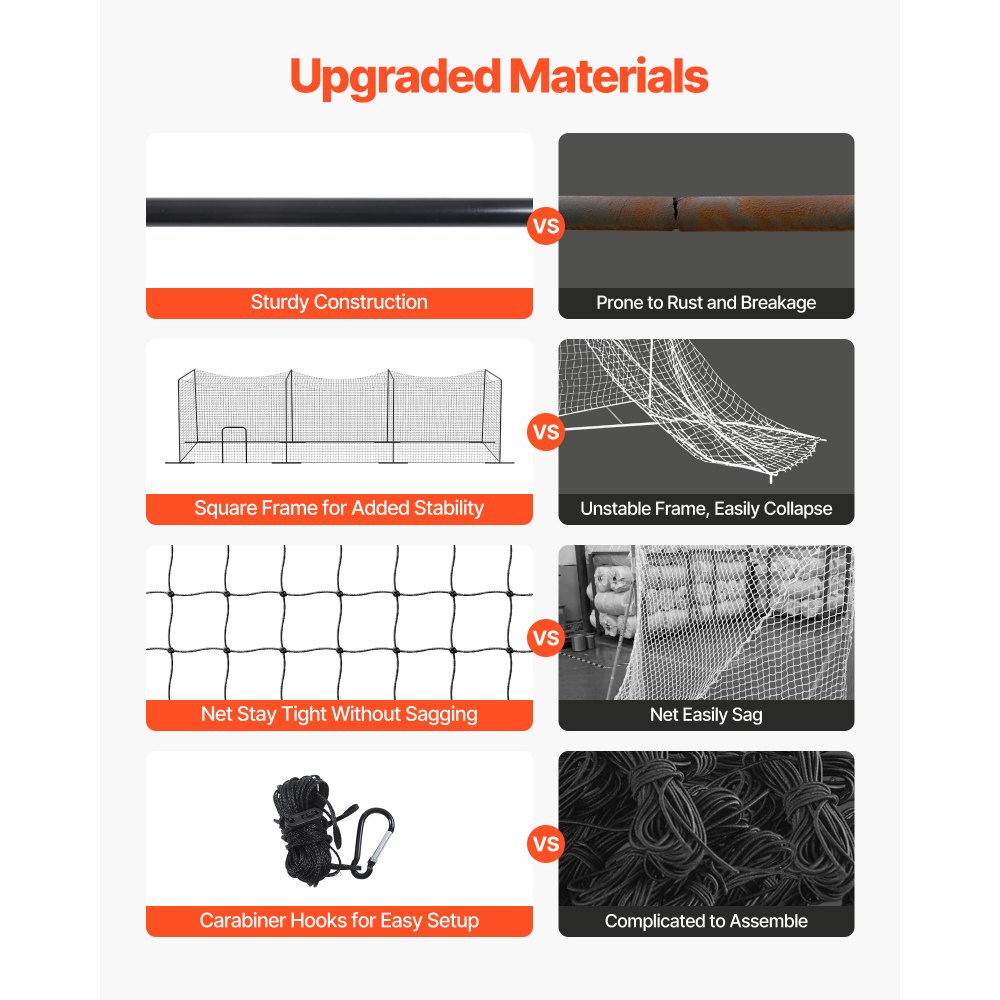 Gyors összeszerelés: Az egyszerű kialakításnak és a mellékelt alkatrészeknek köszönhetően a VEVOR baseball- és softball ütőketrec-háló percek alatt összeszerelhető két ember által. A mellékelt karabinerhorgok egyszerű használatot biztosítanak, így ideális beltéri vagy kültéri edzésekhez.
