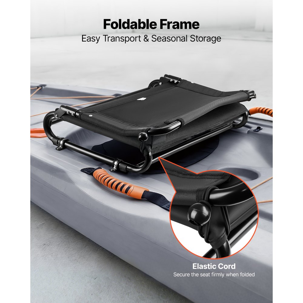 Összecsukható kialakítás: Ez a háttámlájú kajakülés négyzet alakú, összecsukható kerettel rendelkezik, amely kompakt módon összecsukható a könnyű szállítás és szezonális tárolás érdekében, így helyet takarít meg a járművében és a garázsban.
