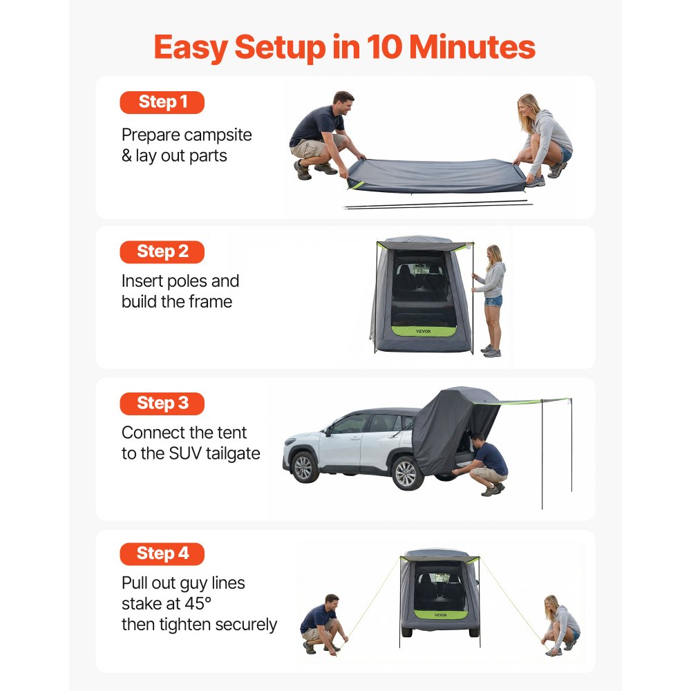 Egyszerű beállítás: Nincs szükség bonyolult szerszámokra. Csak kövesse az utasításokat a gyors beállításhoz, és élvezze a tágas kültéri teret pihenéshez, családi összejövetelekhez és kempingezéshez. (Felfelé emelhető hátsó ajtóhoz illik; oldalra nyíló hátsó ajtókhoz nem.)