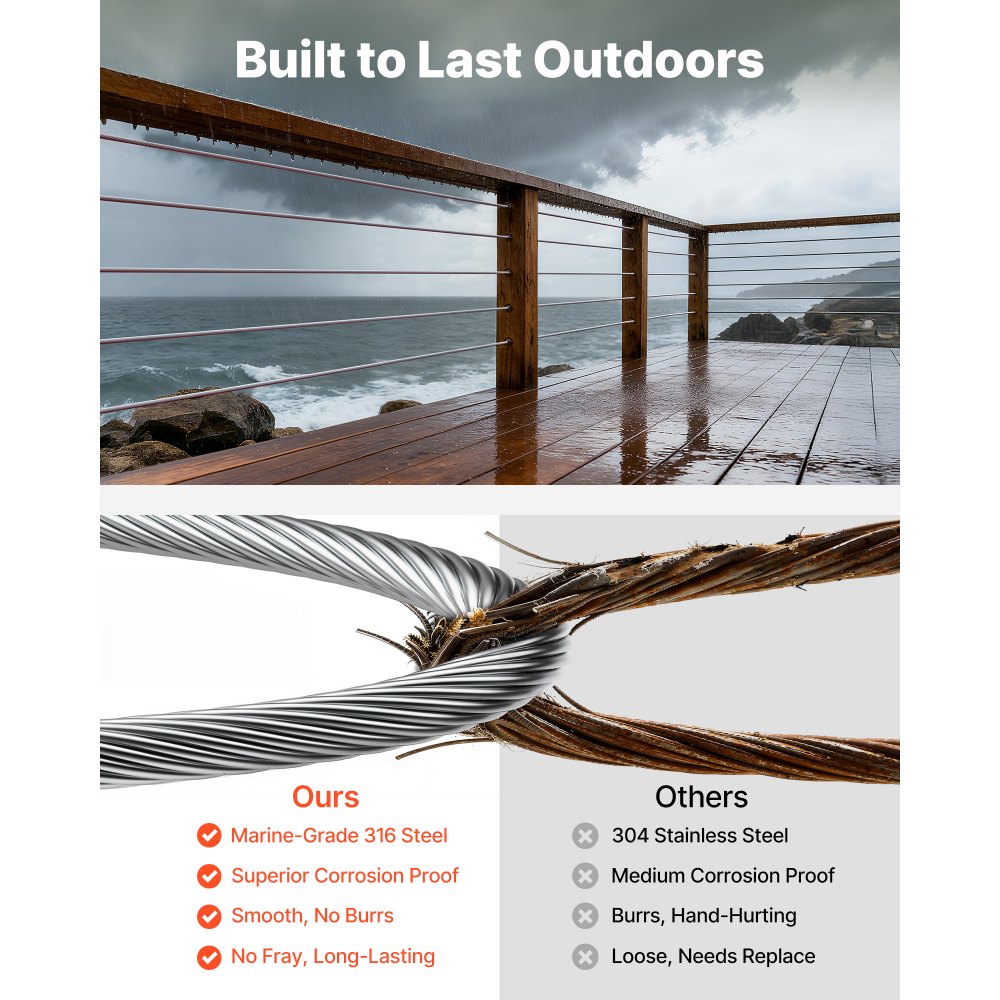 1/8 hüvelyk átmérő és 1760 font szakítószilárdság: Ez az acélkábel szilárd teherbírást biztosít korlátokhoz, kerítésekhez és függőlécekhez. A szerkezeteket stabilan tartja hosszú távú beltéren és kültéren egyaránt, mindennapi terhelés alatt.