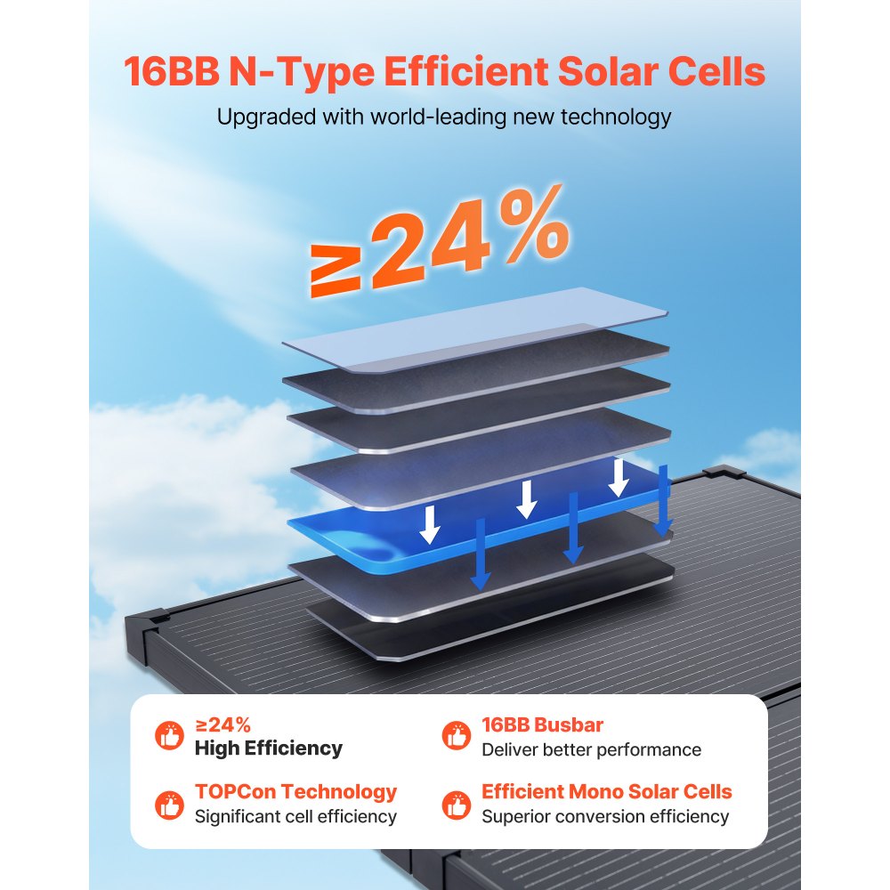 Összecsukható és hordozható: A VEVOR monokristályos napelem könnyen összecsukható kompakt méretre, így könnyen tárolható és bárhová szállítható. Tökéletes kültéri kempingezéshez, lakókocsis kirándulásokhoz, túrázáshoz és vészhelyzeti használatra, így útközben is élvezheti a napenergiát.