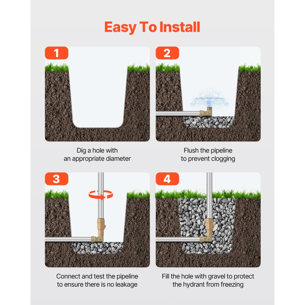 Egyszerű telepítés: Gyors telepítés mindössze 4 lépésben! Ásson egy megfelelő lyukat, és öblítse át a csövet az eltömődések elkerülése érdekében. Ezután csatlakoztassa és ellenőrizze a csövet, hogy biztosan szivárgásmentes-e. Végül töltse fel a lyukat kaviccsal, hogy megvédje a tűzcsapot a fagykároktól.