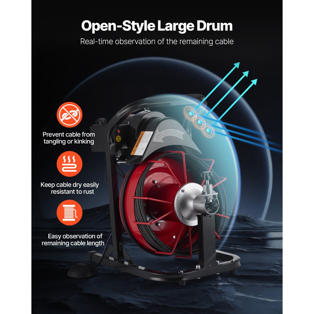 Makacs dugulások ellen: A VEVOR lefolyótisztító gép automatikus adagolórendszerrel rendelkezik, amely a kábelt a lefolyócsövekbe és onnan kihúzza. Az óramutató járásával megegyező/balra irányú vezérlésnek és a levegővel aktiválható lábkapcsolónak köszönhetően a kábel kezelése még könnyebb.