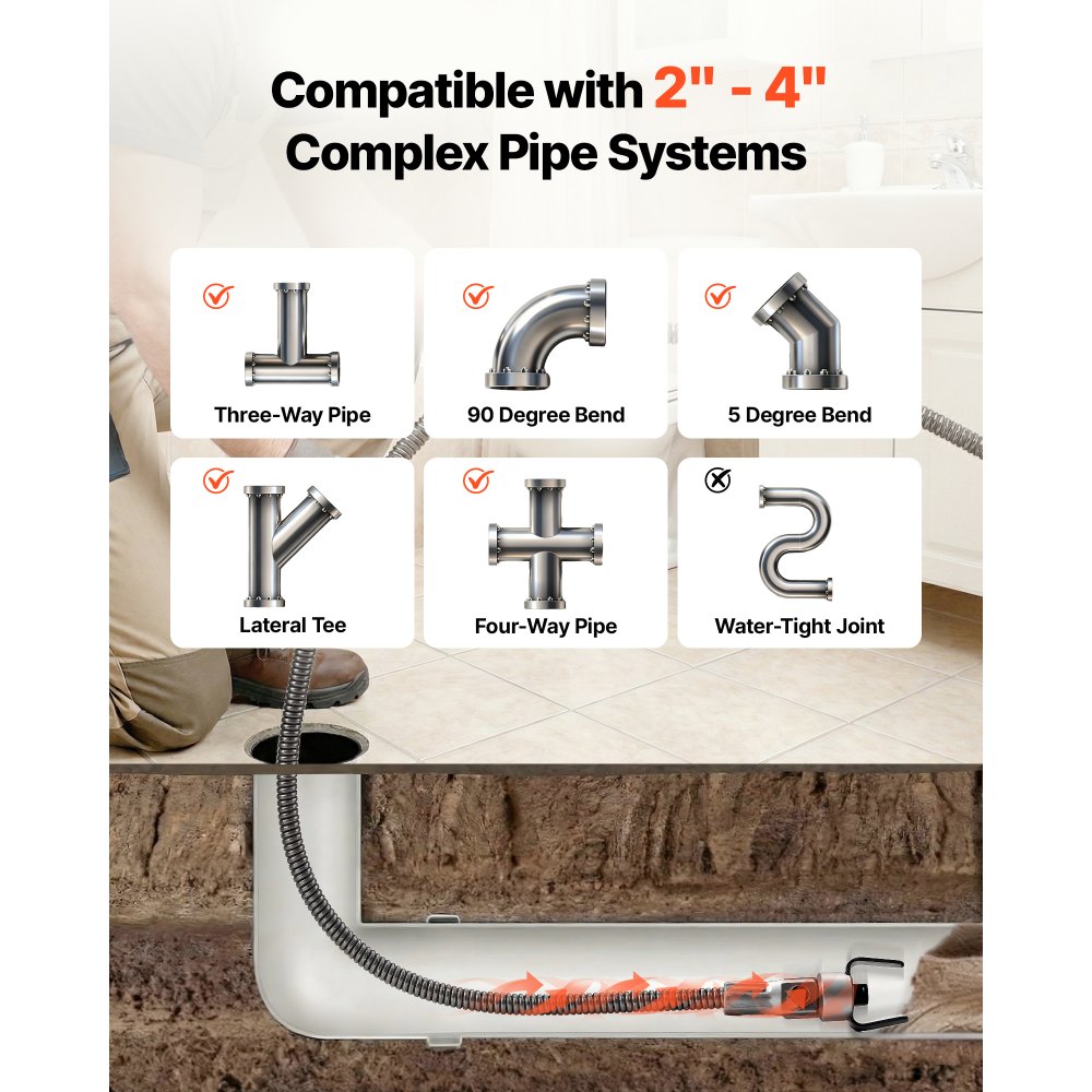 Hatékony duguláselhárítás: A VEVOR lefolyótisztító gép manuális adagolórendszerrel rendelkezik, így a kábelt manuálisan kell be- és kihúzni a csőből. Az 1400 fordulat/perc fordulatszámú nagysebességű motorral párosítva hatékony forgást biztosít a dugulások hatékonyabb eltávolításához.