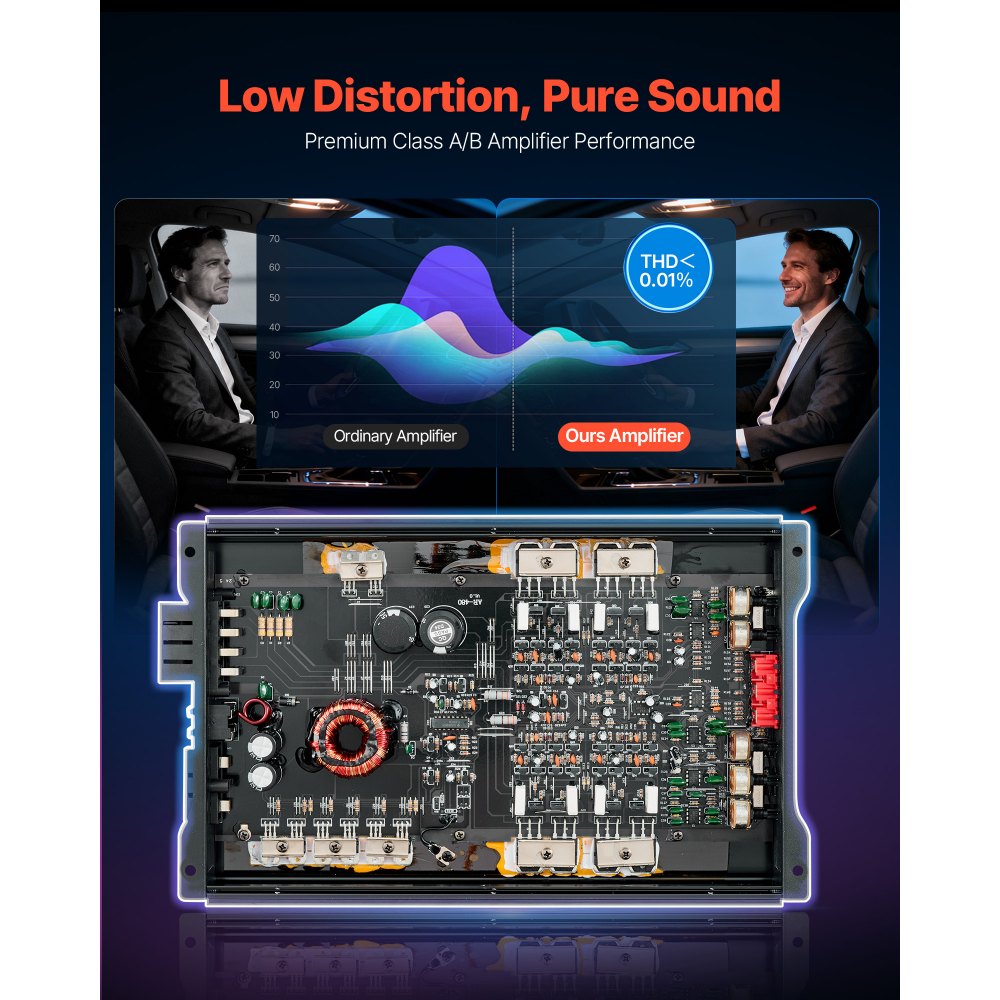 Nagy teljesítmény, kiemelkedő teljesítmény: Ez a 4 csatornás AB osztályú autórádió-erősítő akár 4 x 250 W @ 4 ohm / 4 x 500 W @ 2 ohm (max.) teljesítményt nyújt a tiszta, stabil kimenet érdekében még nagy hangerőn is. Élvezze a teljes és erőteljes autós hangzást.