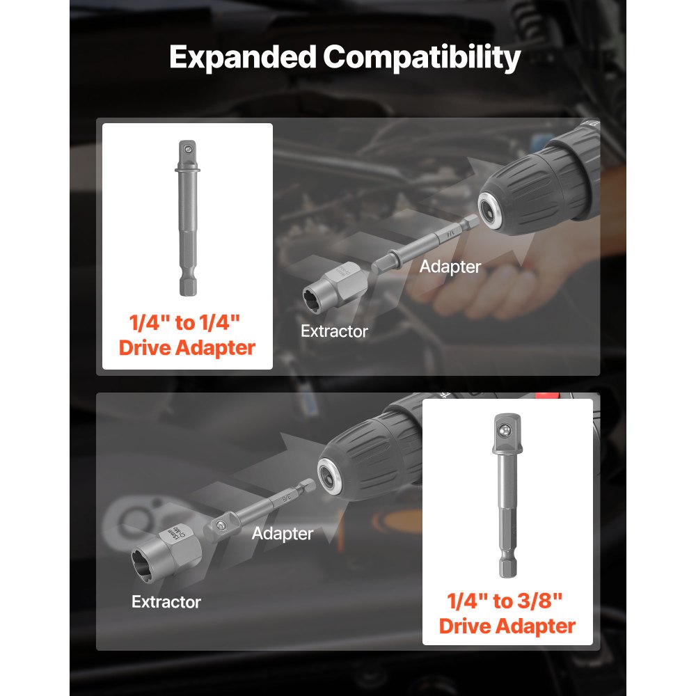 54 darabos kihúzókészlet napi javításokhoz: Ez a csavarkihúzó készlet 17 anyakihúzót, 13 bordás dugókulcs-kihúzót, 16 fúróbitet, 6 spirálcsavar-kihúzót és 2 adaptert tartalmaz. Általános SAE és metrikus méreteket tartalmaz csavarokhoz, anyákhoz és csavaranyákhoz.