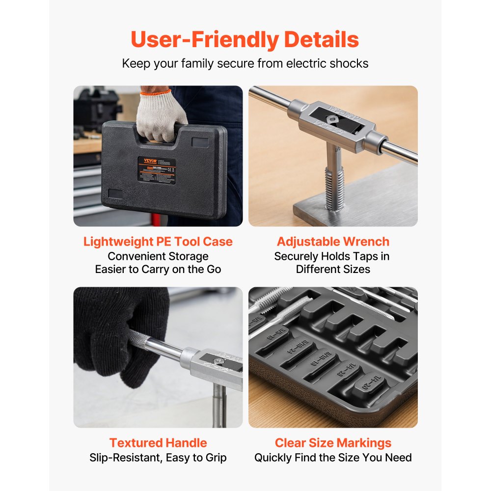 Csapágyacél szerkezet: Prémium csapágyacélból készült és 1472℉ / 800℃-on hőkezelt menetfúró és menetmetsző készlet, amely kiváló keménységet és kopásállóságot biztosít a tartós, nagyfrekvenciás menetvágáshoz.